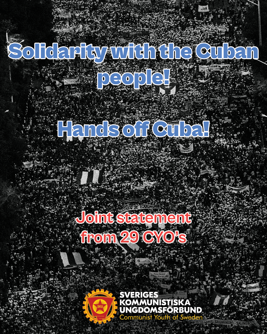 Vi uttrycker vår solidaritet med det kubanska folket, Kubas kommunistiska parti och Kubas unga kommunisters förbund, som med stöd i sina revolutionära traditioner kan och kommer att lyckas slå tillbaka denna attack!